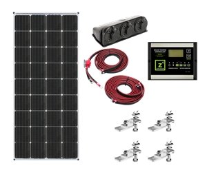 Solar Kit; Hardwired Solar RV Kit; 170 Watt/ 9.4 Amp Charging Current; Class A Monocrystalline Solar Panel; 26.4 Inch Width x 58.3 Inch Height x 1.5 Inch Depth; Surface Mount; 30 Amp PWM Solar Charge Controller; With US Made Solar Panel/ Connecting Wires/ Fuse Holders/ Ring Terminals/ Expandable 3-Port Roof Cap/ Mounting Brackets And Hardware